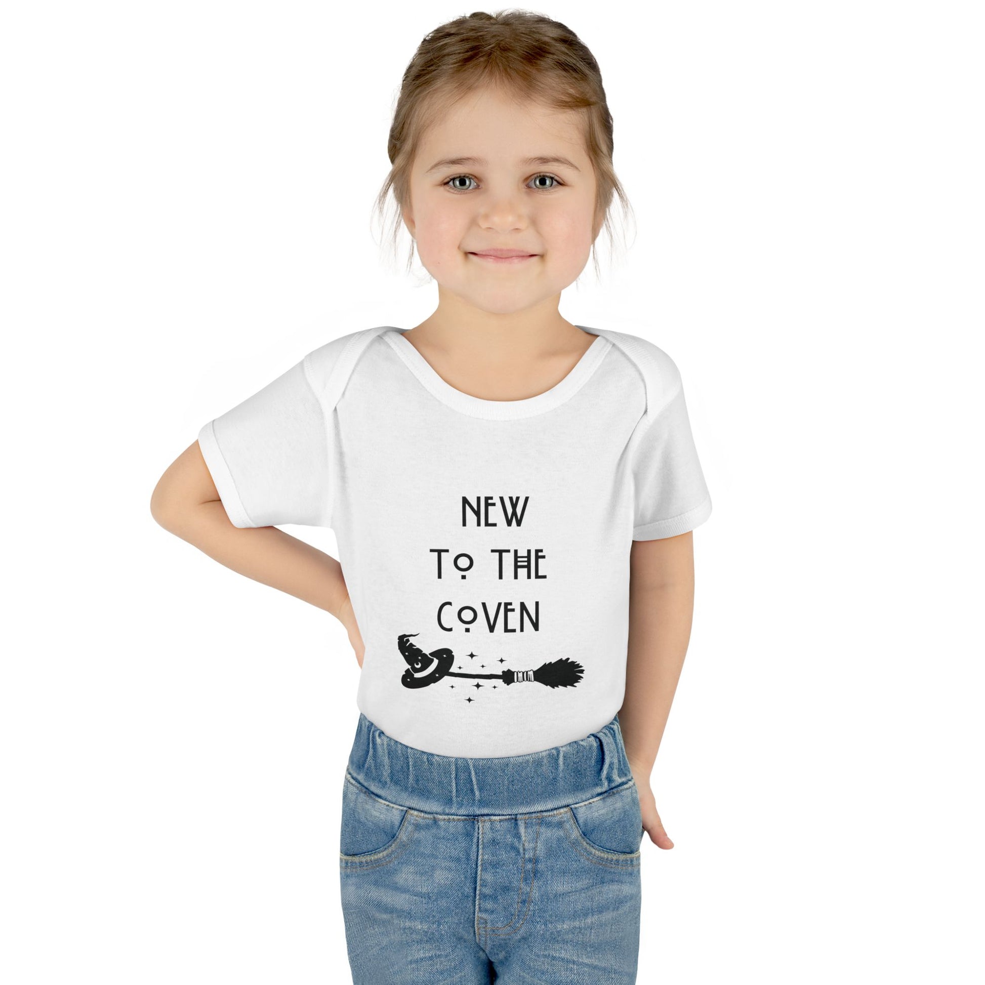 Welcome your little spellcaster in style with this adorable "New to the Coven" baby onesie! Perfect for first Halloweens, spooky photo shoots, or just everyday magic, this soft and comfy bodysuit is a must-have for any baby joining the coven. Featuring a playful witchy design with a hat, broom, and twinkling stars—this piece is spellbindingly cute!